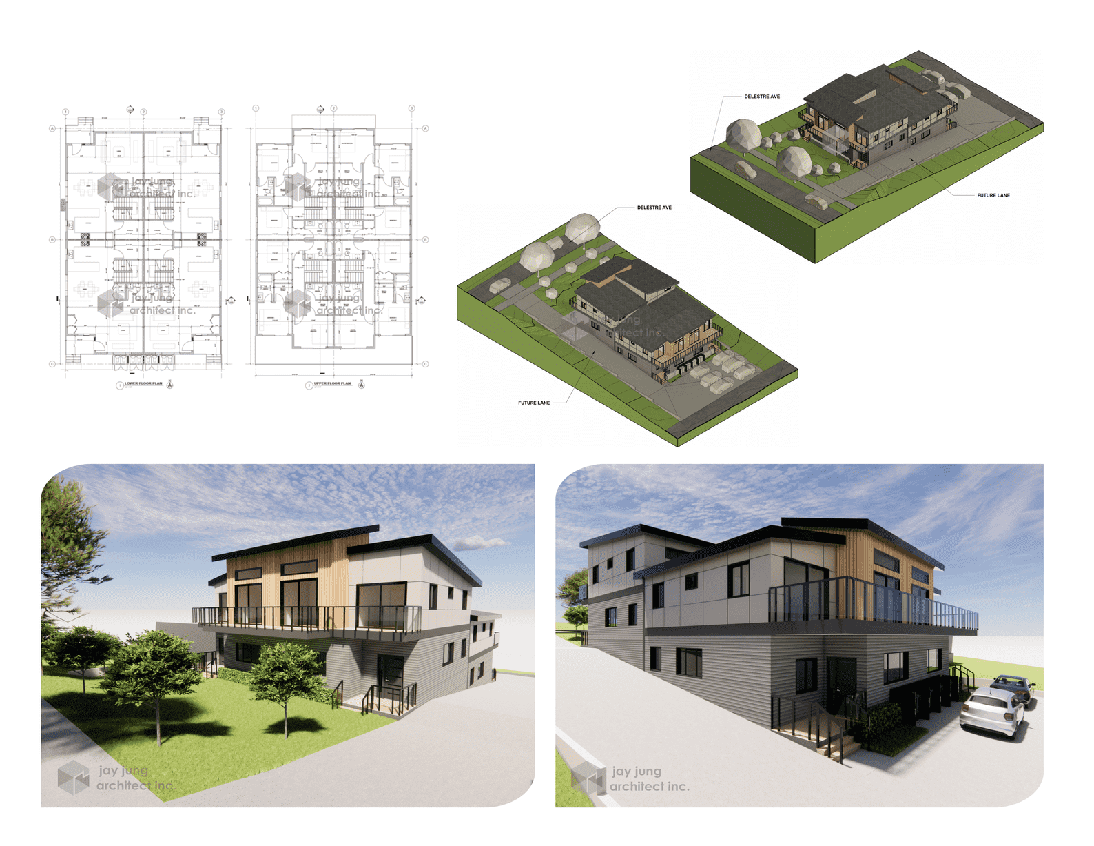A fourplex development in Coquitlam designed under small-scale residential zoning to optimize density and livability. The project uses varied sloping roof forms to break down the overall massing into four distinct units, while maintaining efficient layouts, integrated parking, and a cohesive contemporary design.